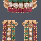 Juego de pendientes y anillo en oro amarillo de 18k triple banda zirconitas, esmeraldas y rubíes sintéticos. Peso total 13,40g