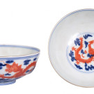 Pareja de cuencos en porcelana esmaltada con decoración de dos dragones rojos cada uno sobre fondo blanco con volutas de nubes en azul. China, periodo Guangxu de la Dinastía Qing, S. XIX