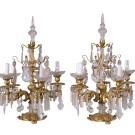 Pareja de candelabros de cinco luces cada uno en bronce dorado con lágrimas en vidrio transparente. Fns. S. XIX