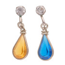 Pendientes en plata con forma de lágrima facetada en cristal uno en color amarillo y otro azul.