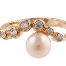 Sortija en plata 925mm ornamentada con circonitas y perla de imitación de 6,5mm de diámetro. Peso total de la pieza: 2g.