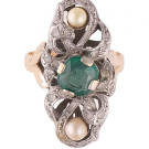 Sortija tipo lanzadera en oro de 18k bicolor. Ornamentada con vidrio strass imitando una esmeralda, perlas de agua dulce cultivadas y vidrios en talla 8/8. Peso total de la pieza: 6,16g.