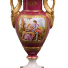 Jarrón en porcelana esmaltada de Salvador Mallol de color burdeos con decoraciones en dorado, asas en forma de cisne y cartela con escena galante. España, S. XX