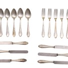 Cubertería de Meneses en alpaca para seis servicios con decoración vegetal en la parte inferior de los mangos. S. XX