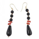 Pendientes lagos con lágrimas y cuentas de ónix y ramitas de coral italiano. Cierre de gancho en oro italiano. Peso total de las piezas: 7,70g.