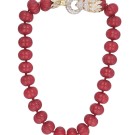 Gargantilla de cuentas de raíz de rubí de 12 x 15mm. Cierre en forma de cabeza de león en plata dorada italiana con rubíes y circonitas. Largo total: 46,5cm. Peso total de la pieza: 186,40g.