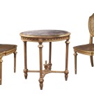 Lote compuesto por dos sillas y una mesa de estilo Luis XVI en madera tallada y dorada. S. XX