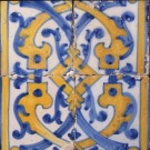 Cuatro azulejos en cerámica esmaltada en azul y amarillo sobre fondo blanco. España, S. XVII