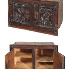 Pequeña alacena en madera de nogal tallada con dos puertas en el frente con decoración de dos medallones ovales con personajes de perfil. España, S. XVI