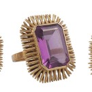 Aderezo de cocktail en oro amarillo de 18k con amatistas talla esmeralda. Pendientes con cierre catalán. Anillo talla14. Peso total de las piezas: 26,34g