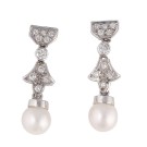 Pendientes en oro blanco con flor de lis invertida diamantes talla brillante de 0,48ct, perla cultivada de 7,5mm. Cierre de presión. Peso total de las piezas: 6,24g