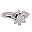 Anillo tipo roseta en oro blanco con diamantes talla brillante, el central de 0,35ct y los exteriores de 0,24ct. Peso total de la pieza: 3,74g