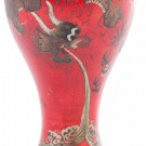 Pequeño jarrón chino en laca roja policromada con dragones. FF. S. XIX.