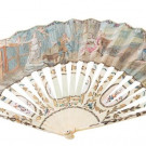 Abanico Imperio con varillaje de tipo "esqueleto" en hueso con incrustaciones en nácar, guardas a juego y clavillo en nácar. País en papel pintado. Ppios. S. XIX.