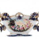 Lote compuesto por pareja de jarrones y centro isabelinos en porcelana con decoración dorada y motivos florales polícromos. España, S. XIX
