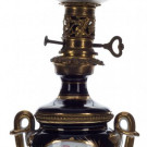 Quinqué en porcelana esmaltada en azul con decoración floral dentro de cartelas en reserva y guarniciones en bronce. Ffs. S. XIX