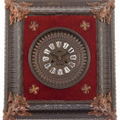 Reloj de pared con marco en metal repujado con guarniciones en las esquinas y esfera con numeración romana sobre placas de porcelana blanca. España, Fns. S. XIX - Ppio. S. XX