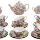 Compuesto por: 11 tazas, 12 platos, tetera, azucarero y jarrita para leche. Algunas piezas presentan marca en la base.