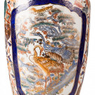 Jarrón en porcelana oriental de estilo Imari con decoración esmaltada polícroma de motivos vegetales y florales con pavos reales. S. XX