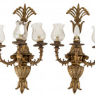 Pareja de apliques de tres luces en bronce dorado con tulipas en vidrio. Ppios. S. XX.