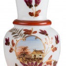 Jarrón en opalina blanca con boca ondulada, motivos florales pintados a mano y paisaje en cartela. S. XX.